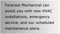Forecast Mechanical provides complete heating, ventilation, and air conditioning service for industrial and commercial properties including office buildings, factories, warehouses, condominiums, and hotels. While we can't predict the weather outdoors, we can ensure that your indoor environment remains comfortable.